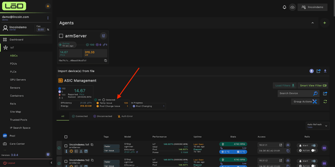 The States & Issues section displays a summary of any active problems detected with your ASICs. If there are no issues, this section will not appear under ASIC Management. When issues are present, States & Issues will be shown, listing each issue by name (for example, “Fan Issue”) along with the number of ASICs currently affected. This allows you to quickly identify and address any devices experiencing problems.